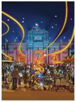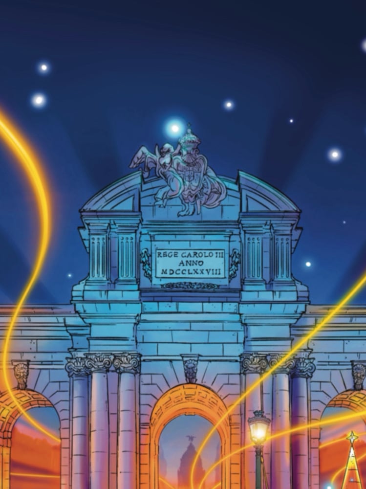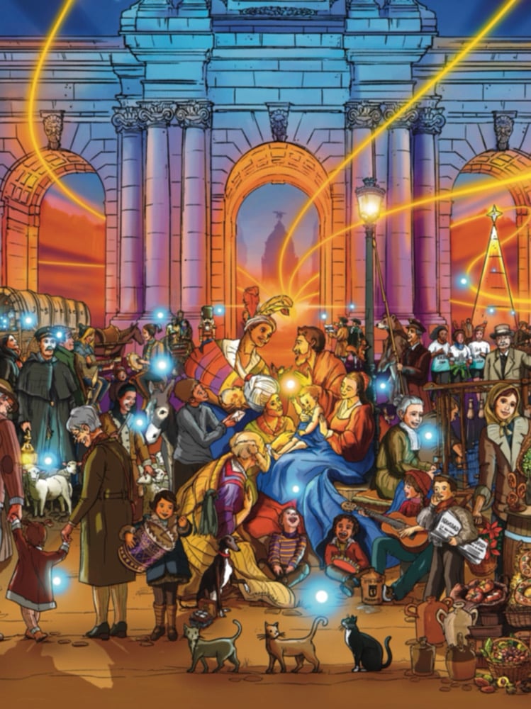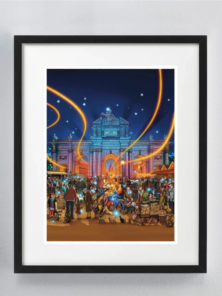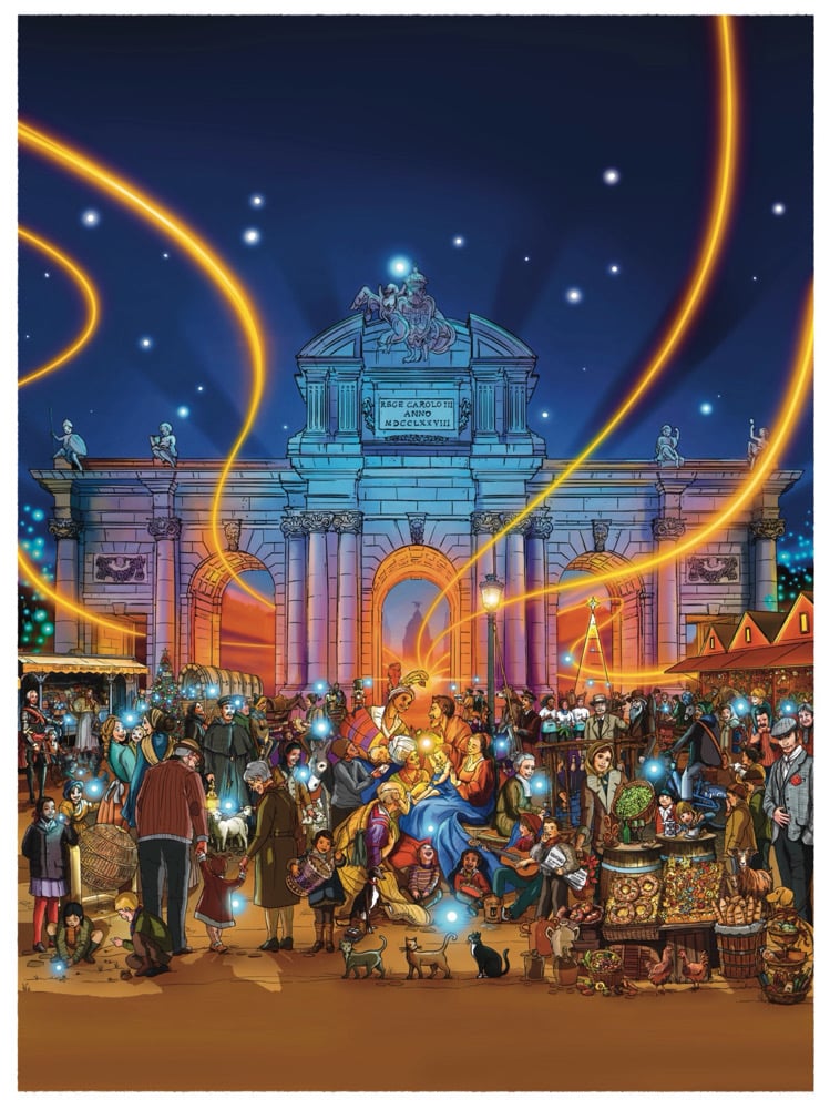 En el cartel de la Navidad de 2024 de Madrid, con el lema “Madrid, Puerta de la Navidad”, represento una escena navideña frente a la Puerta de Alcalá, en un viaje a través del tiempo. Con el propósito de contar muchas de las historias que este símbolo de Madrid lleva contemplando desde 1778 hasta el día de hoy, empleando un anacronismo intencionado, conviven diferentes personajes, profesiones, vestimentas, objetos y ambientes de un período de tiempo de casi 250 años.